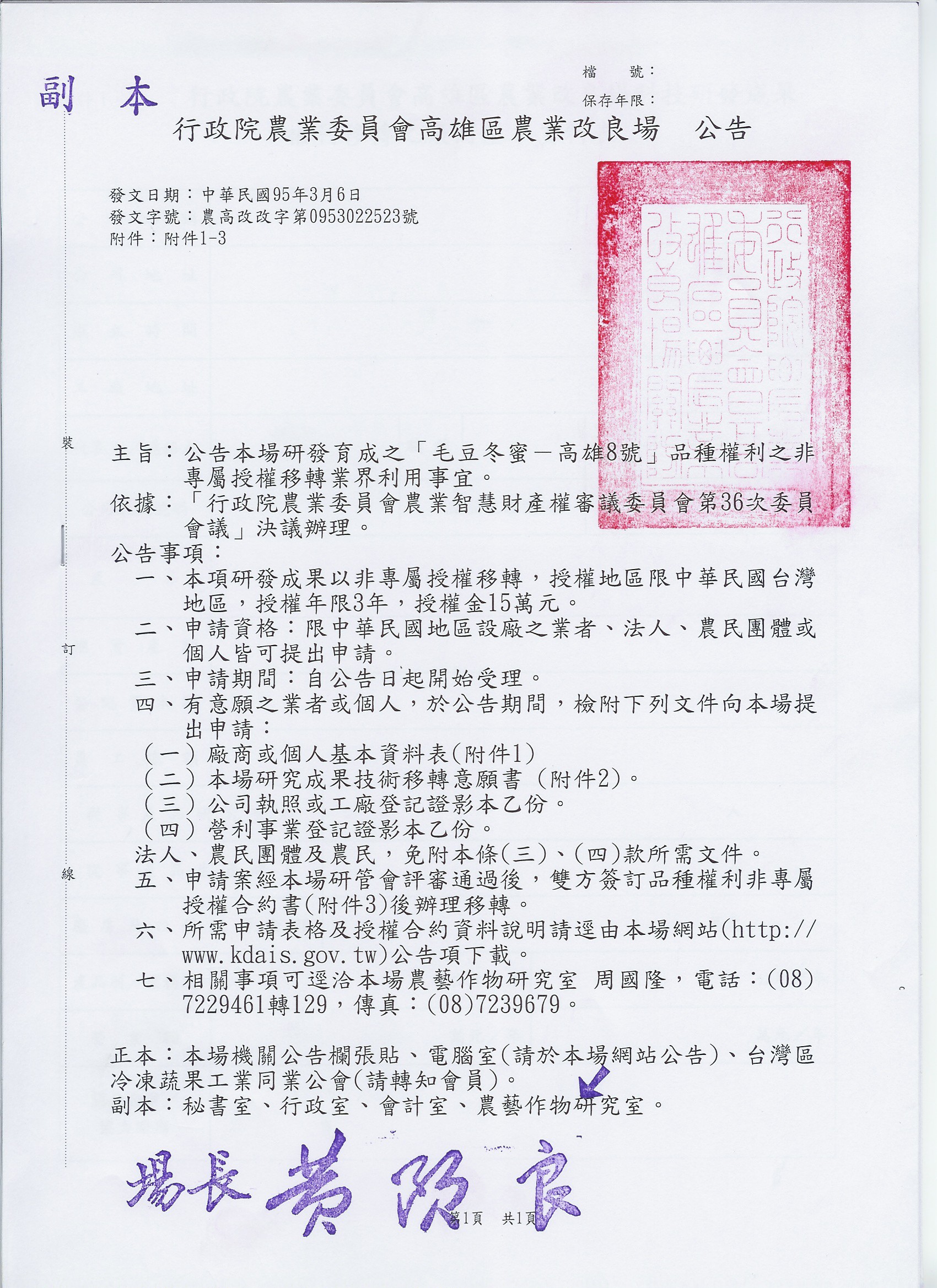 「毛豆冬蜜-高雄8號品種權利」研究成果之非專屬授權移轉業界利用