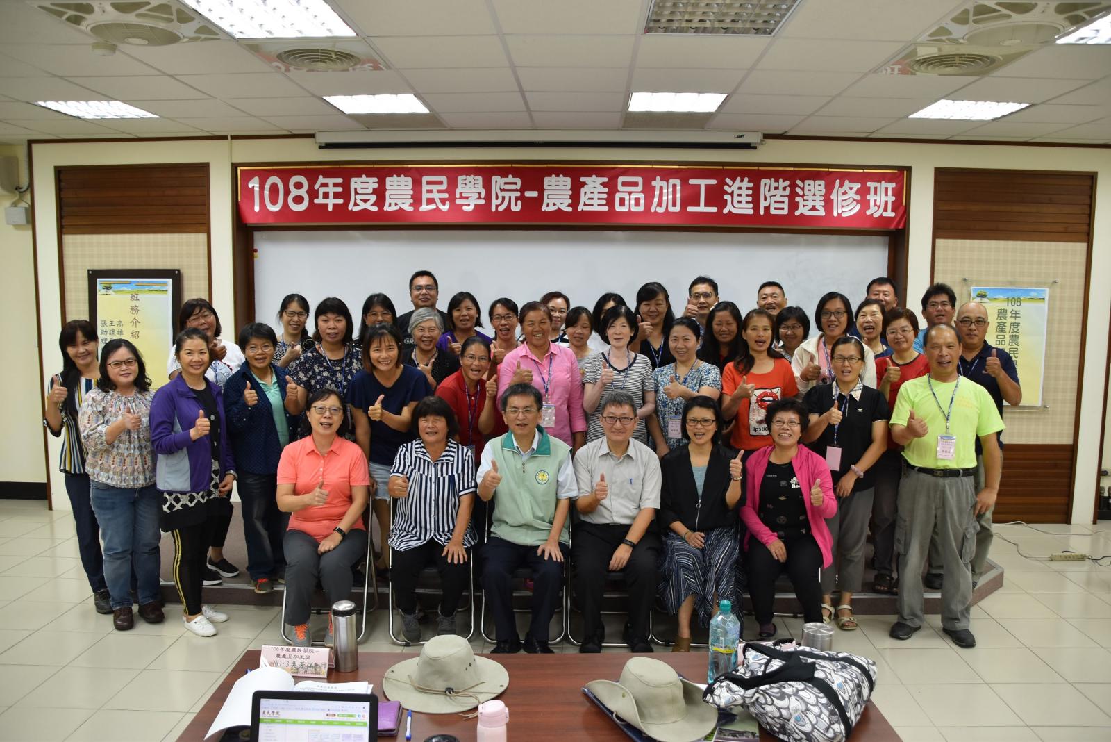 高雄場戴順發場長指出,農產品加工進階選修班自本(108)年7月9日起至11日連續3天辦理,計有來自全國各地共40名學員完成訓練,女性34名、男性6名。本訓練為提升農民對農產品加工、安全衛生管理能力及加強農產品初級加工技術,課程內容除介紹農產品多元加工技術,也安排學員認識該場新成立的「農產加值打樣中心」,該中心可協助農民進行加工前之效益及成品是否符合預期等評估。另也邀請食品衛生安全管理單位第一線稽核人員,講授食品安全衛生管理相關法規並落實遵循GHP(食品良好衛生規範準則),以生產安全優質的國產農產加工品,分散農產品生產、銷售風險。因受訓學員多數有將自己生產的農產品簡易加工後自行銷售的經驗,故紛紛帶來各式自家農產加工品與老師及同學分享,同時在操作經驗交流過程中,與講授理論內容相互呼應,彼此間互動溝通、教學相長。